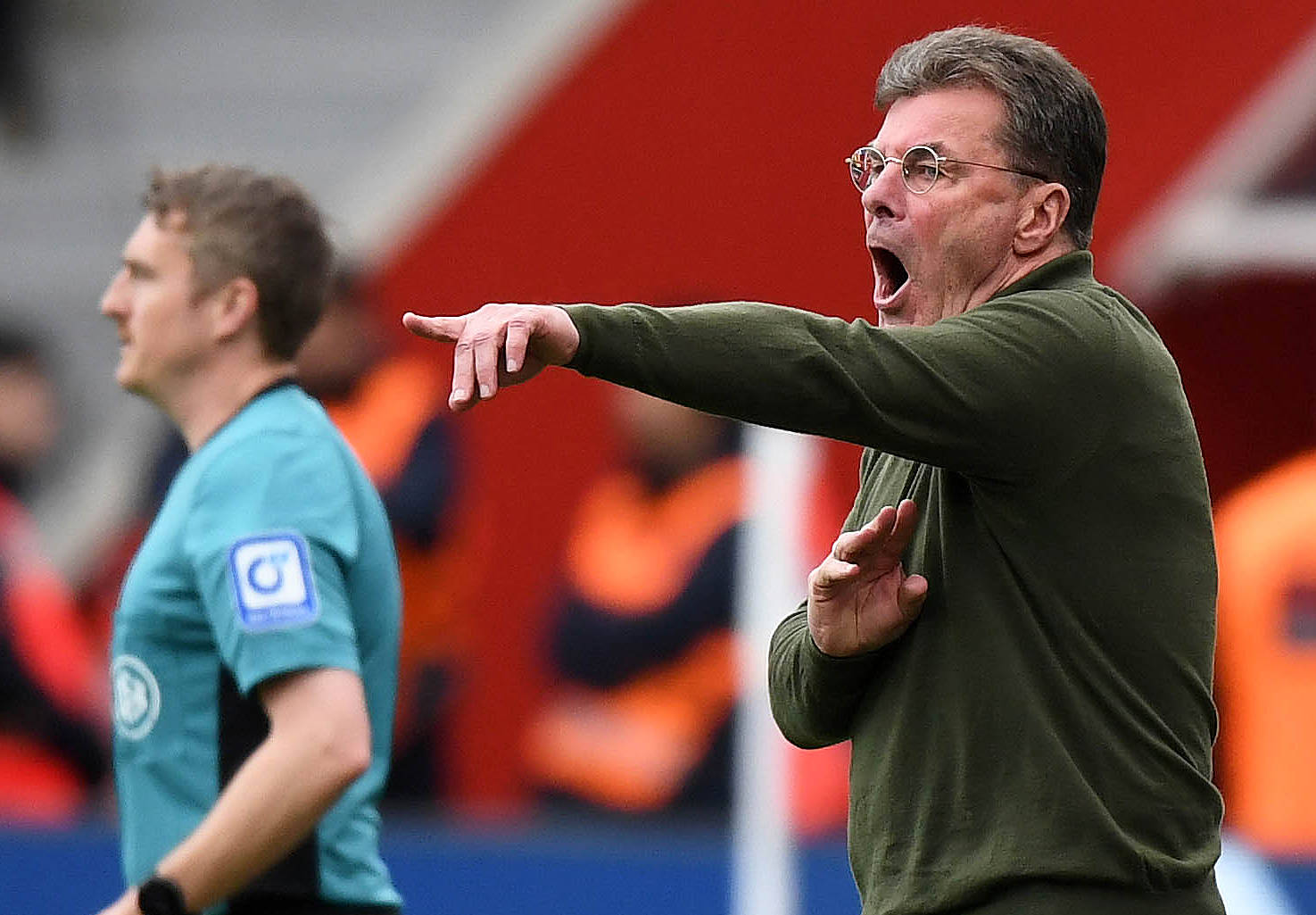 4月4日,沃尔夫斯堡队主教练黑金(右)在场边指挥。 新华社发(乌尔里希·胡夫纳格尔摄)